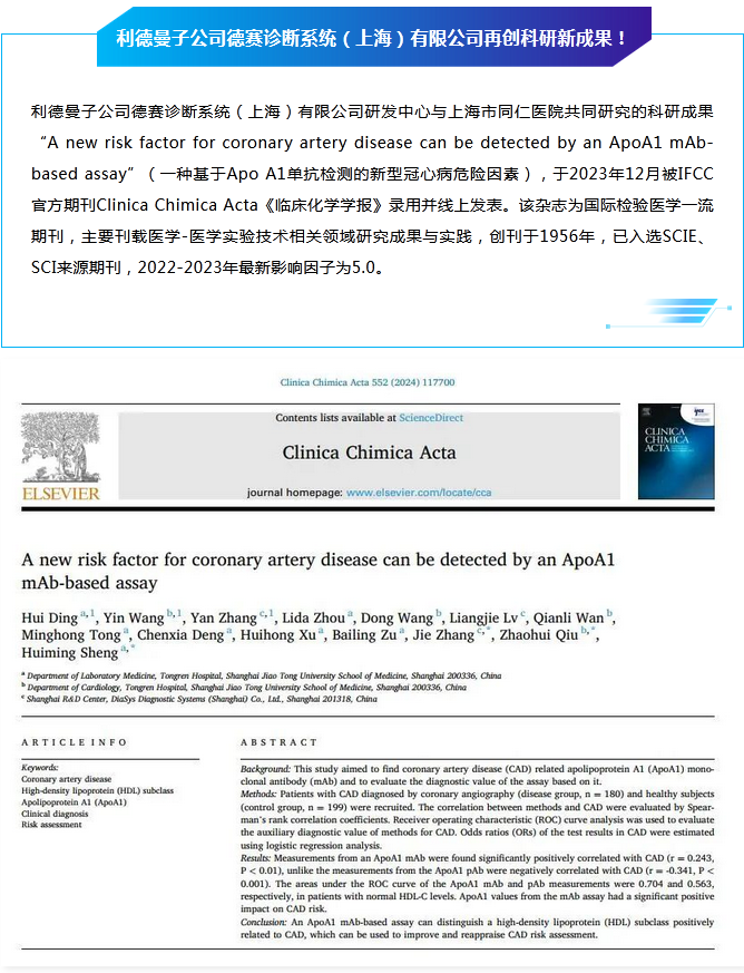 科研创新 │ 乐动在线(中国)子公司德赛诊断系统(上海)有限公司联合上海市同仁医院再创科研新成果